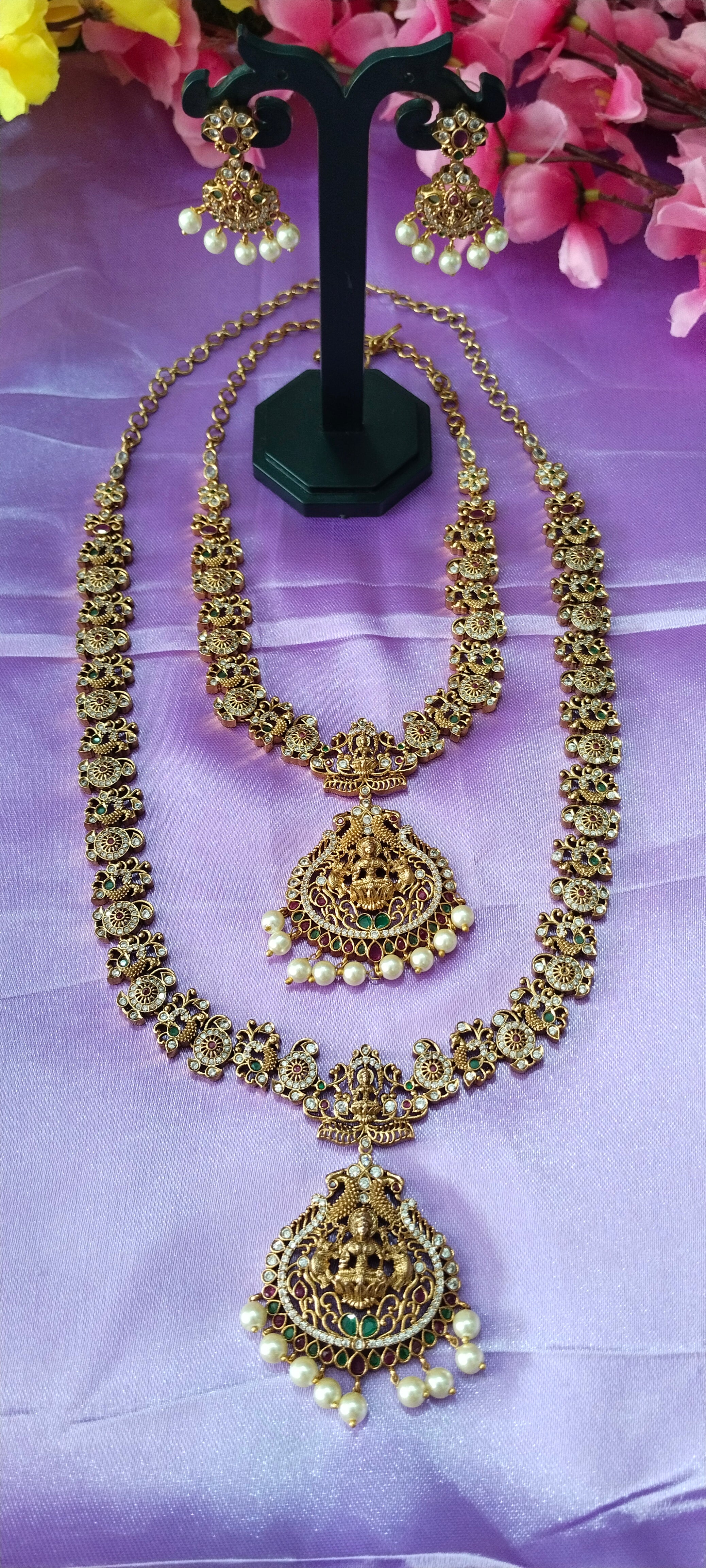 A regal Laxmi Devi jewelry set featuring a long and short necklace combo. Perfect for bridal wear, weddings, and festive occasion with earings This Laxmi Devi set combines a long haram and a short necklace to create a layered, opulent look. Featuring intricately crafted motifs of Goddess Laxmi, the set reflects traditional artistry and cultural richness. Each piece is adorned with sparkling stones and polished detailing, adding grandeur and elegance. Ideal for bridal ensembles, festive celebrations, and traditional ceremonies, this set ensures a royal statement at every occasion.