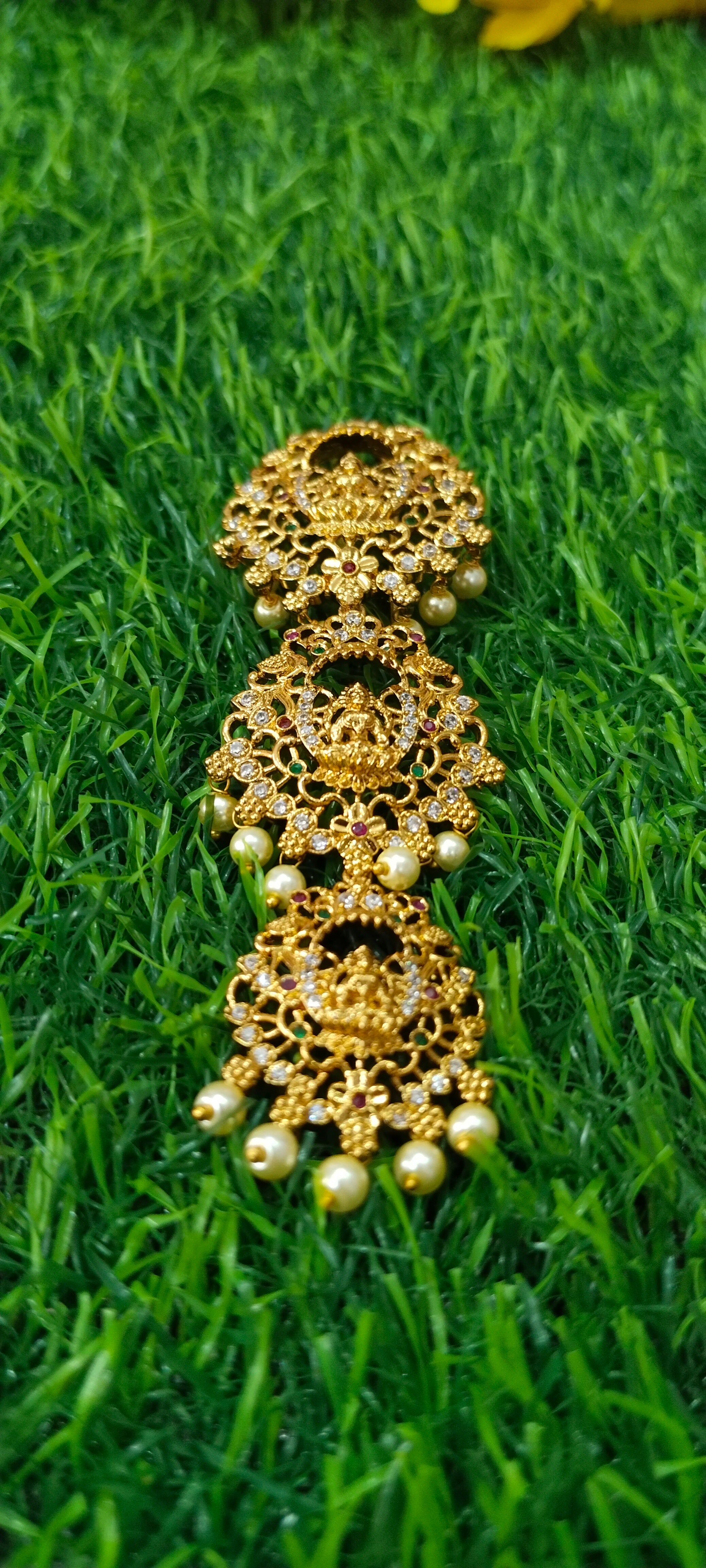 Each motif is crafted with precision, reflecting temple-style heritage jewellery that enhances bridal, festive, and classical dance hairstyles. Lightweight yet durable, the jada ensures comfortable wear throughout long ceremonies while maintaining its royal shine. Ideal for weddings, puja events, engagements, and cultural performances, this Lakshmi motif hair jada adds a touch of divine beauty and timeless charm to any traditional ensemble.