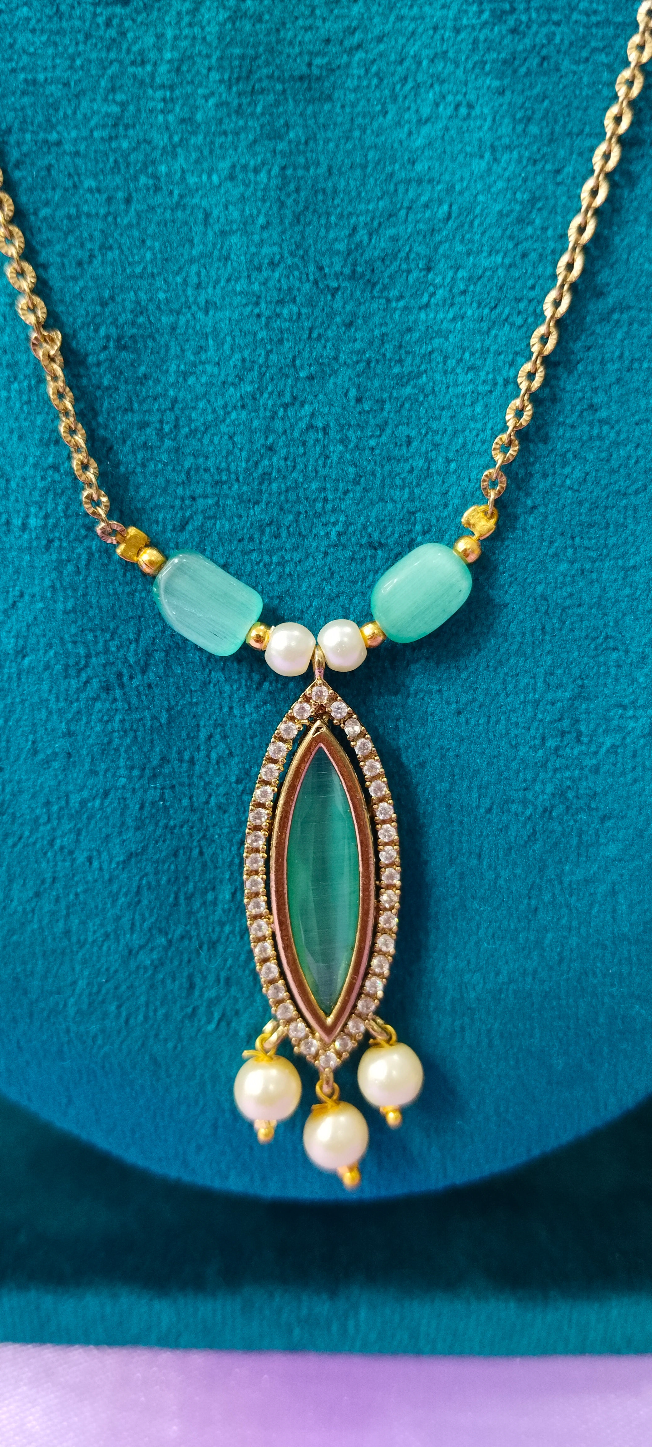 The sea-green stone evokes calm and elegance, offering a soft yet eye-catching contrast against the gold plating — a balance of cool and warm tones that draws attention without overpowering.