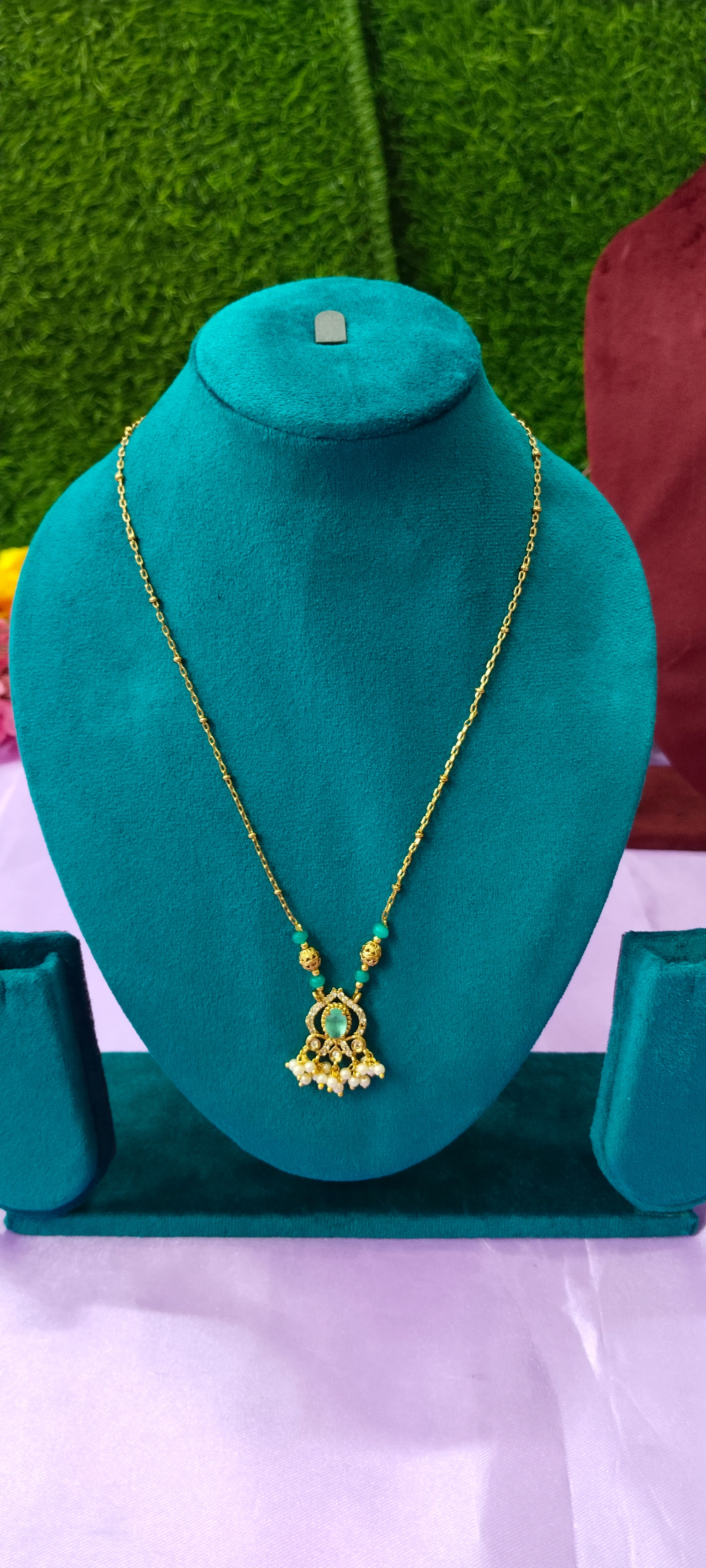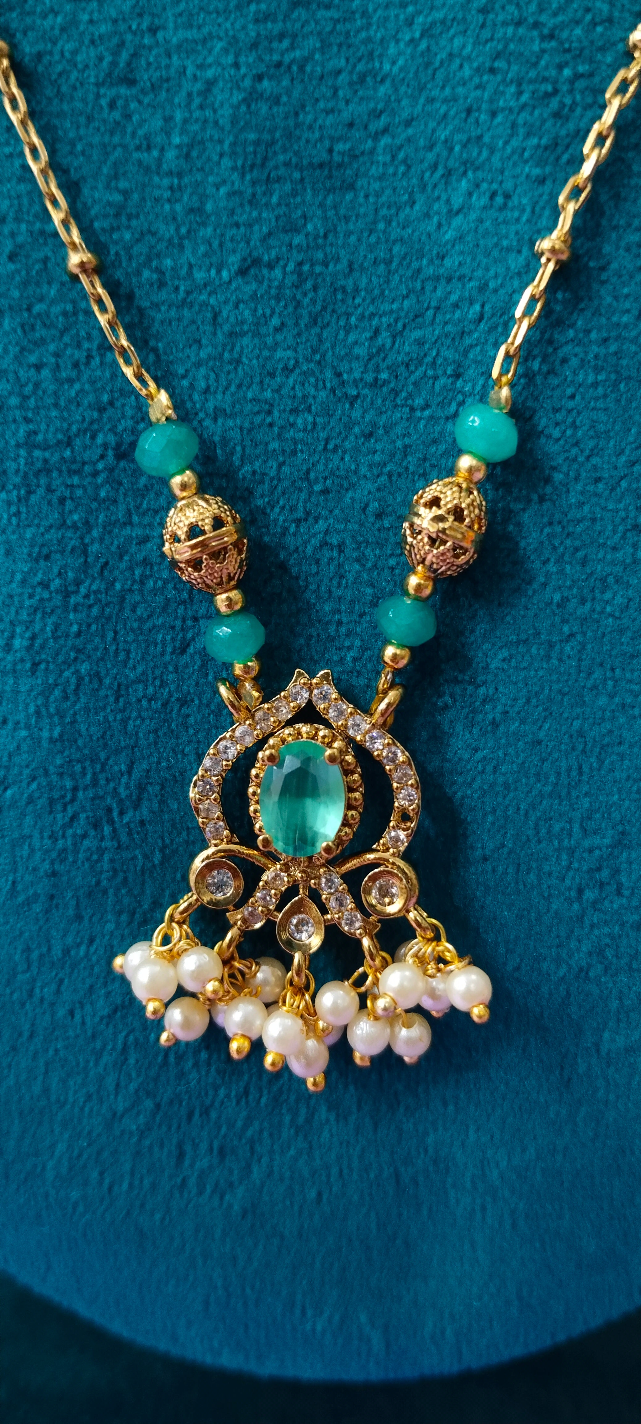 Gold plated Sea green colour pendant with white stone