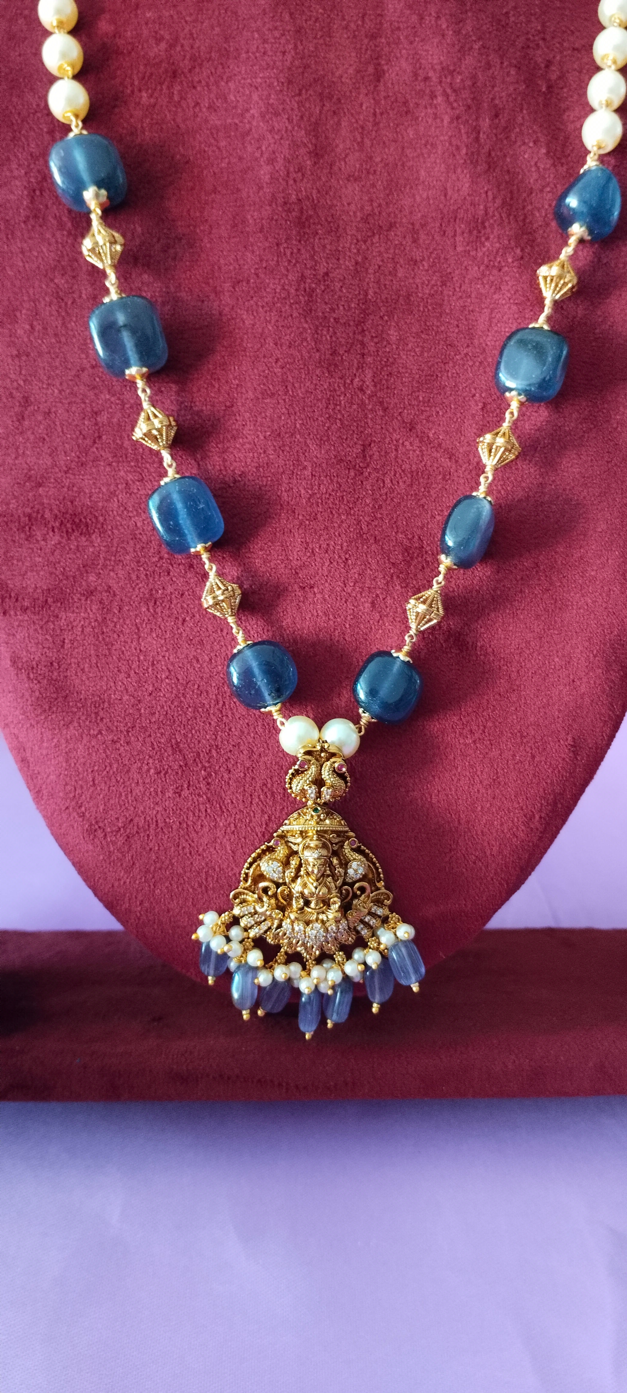 Long Golden Laxmi Locket with Dark Blue Beads Chain — Pendant Only (no earrings)