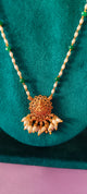 Elevate your elegance with this exquisite Nakshi Ball Pendant. Featuring a striking green stone set in a gold-plated design, this pendant showcases intricate craftsmanship reminiscent of traditional artistry. The rich green hue of the stone is complemented by the warm glow of the gold plating, making it a perfect statement piece for any occasion.