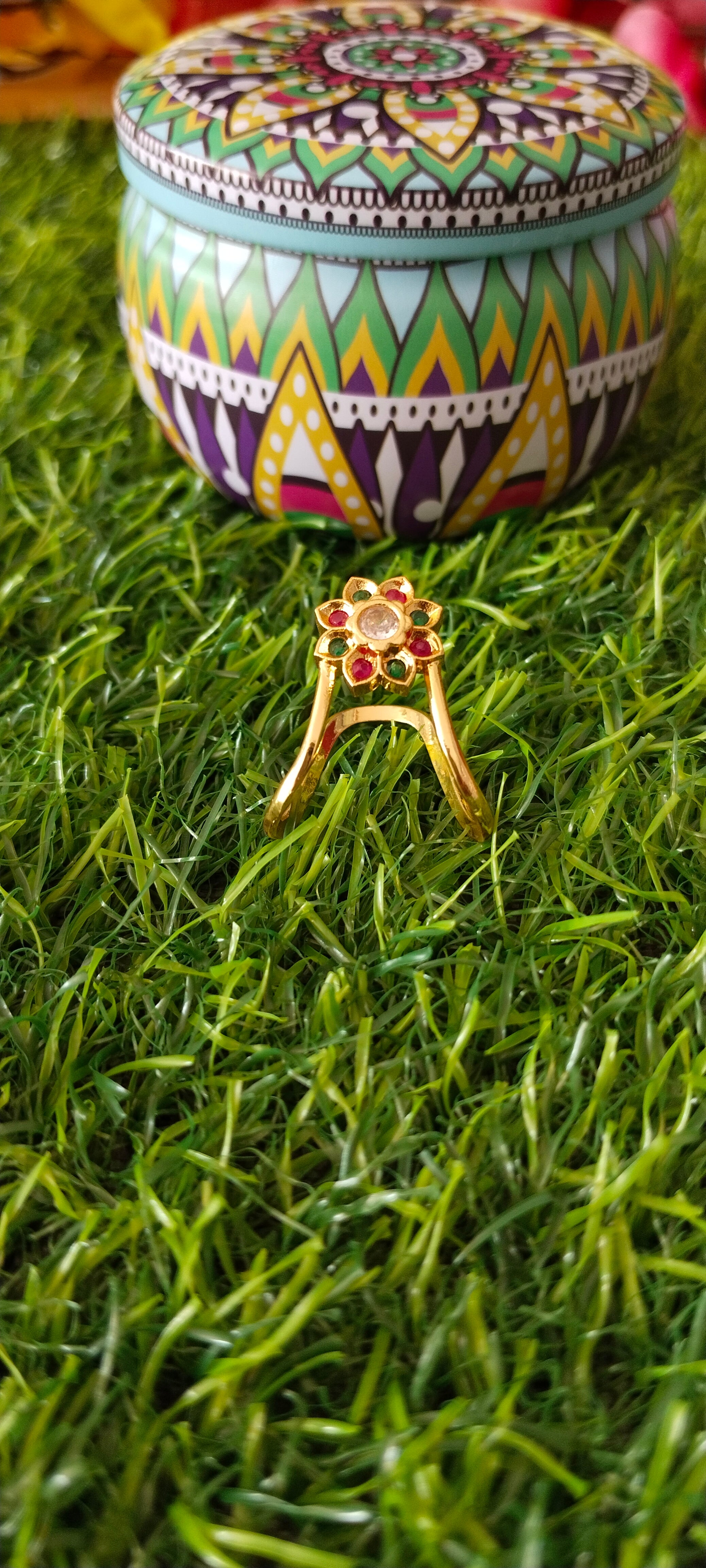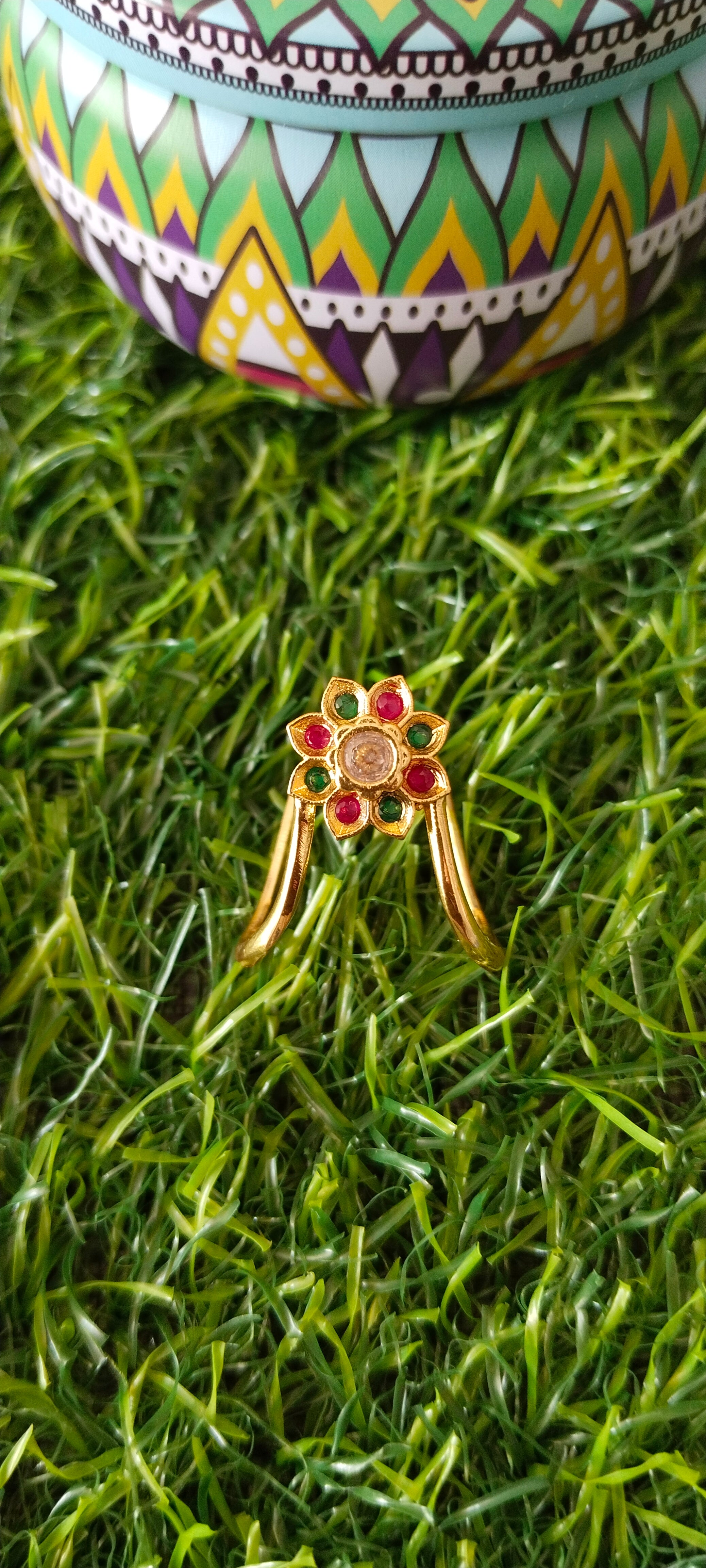Designed with intricate detailing and a balanced structure, this ring complements ethnic attire such as sarees, silk lehengas, and temple wear. Comfortable to wear and visually striking, it is ideal for daily traditional use as well as festive and religious occasions.