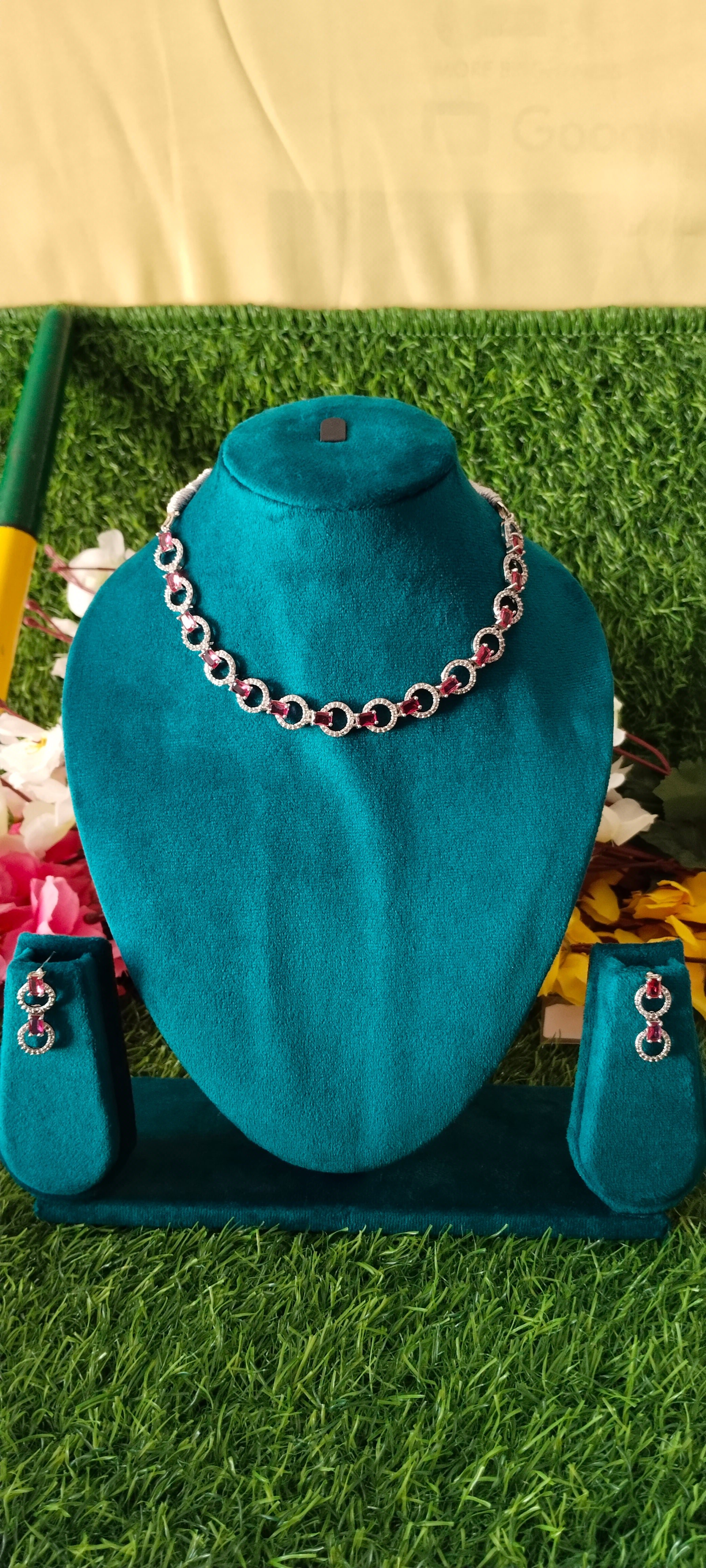 Cz ring design necklace pink colour with matching earrings