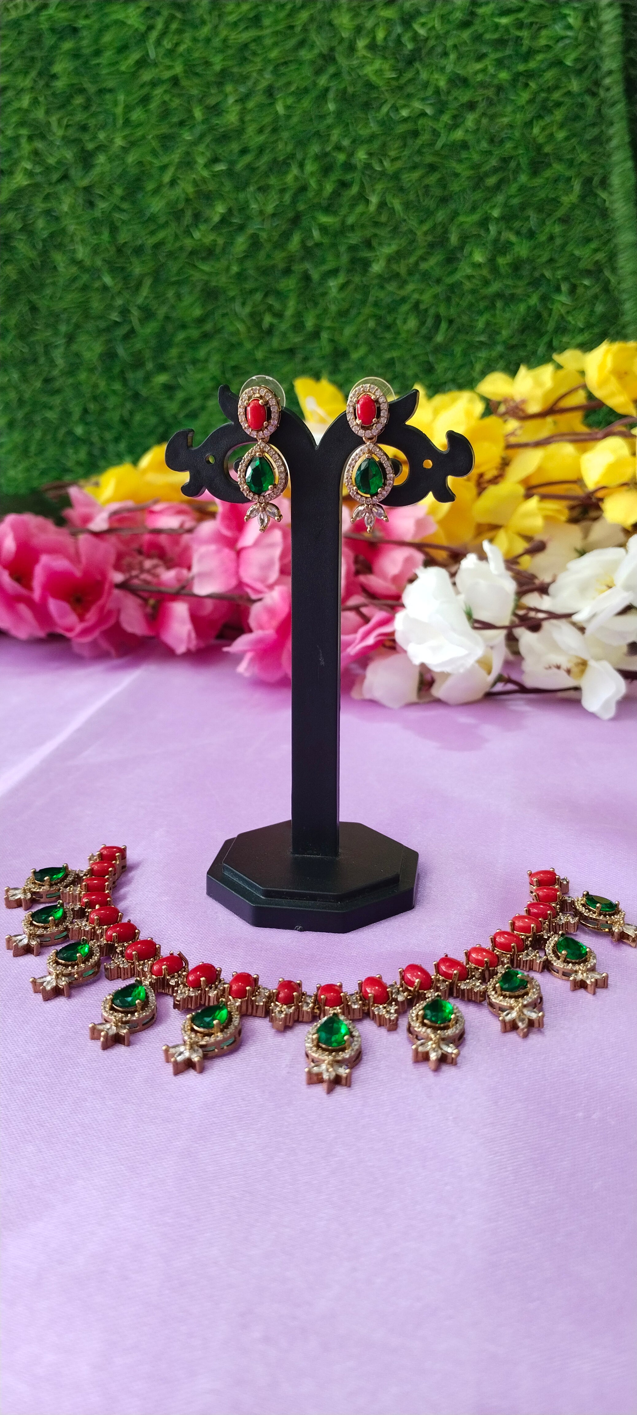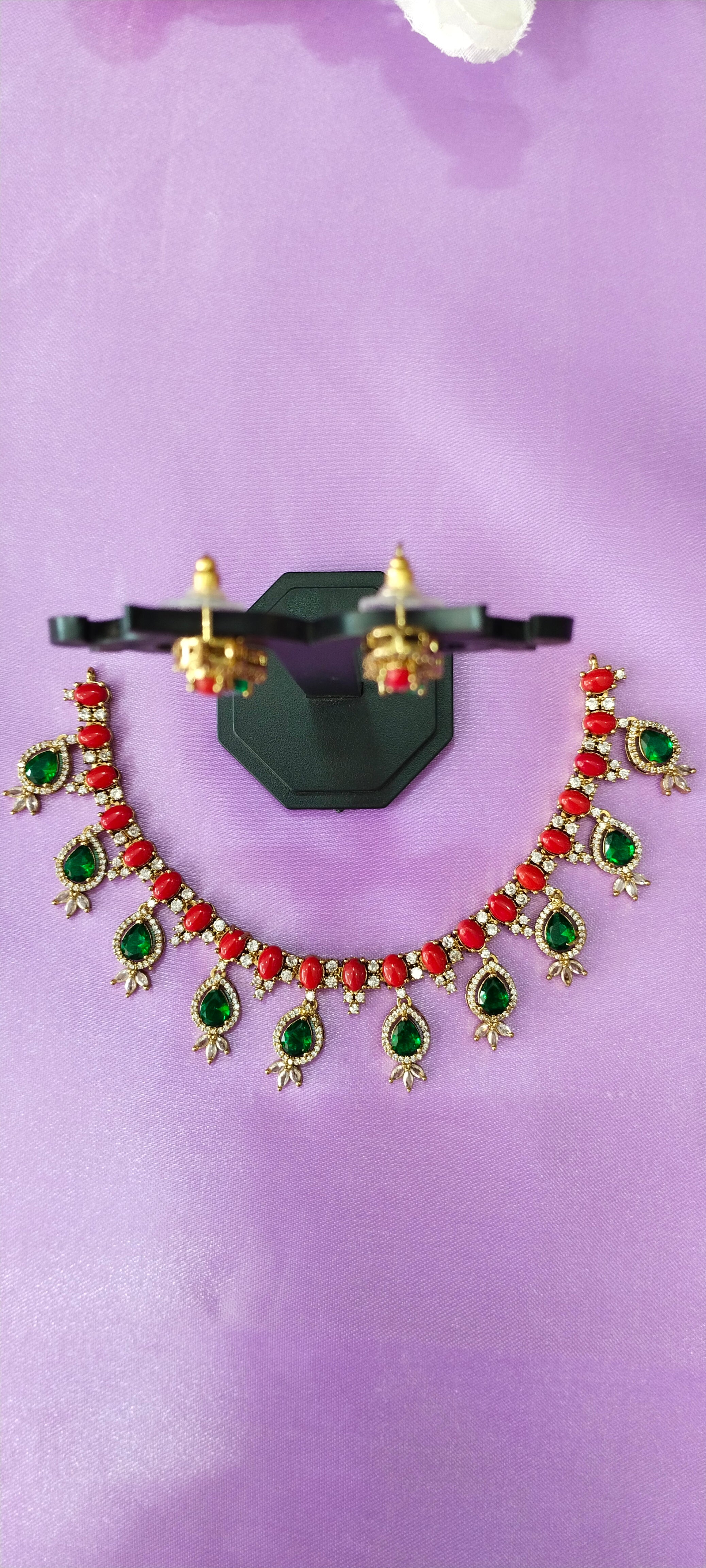 Add a touch of vintage glamour to your ensemble with this Premium Victorian Necklace Set, featuring exquisite red and green stones that exude royal elegance. Inspired by classic Victorian designs, the necklace showcases intricate craftsmanship and a timeless appeal, making it perfect for weddings, festive celebrations, and special occasions.