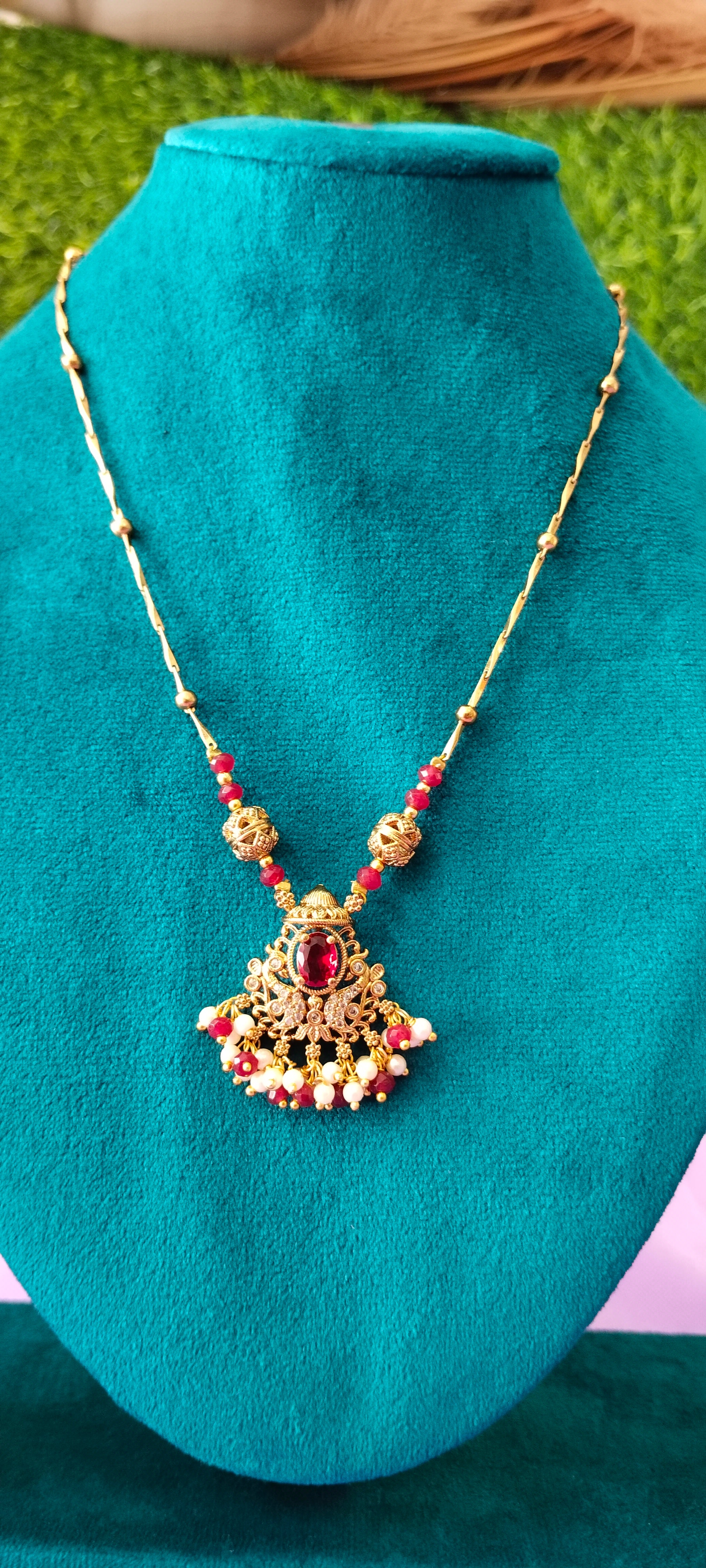 Adorning the pendant are rich red stones—deep, vibrant hues that evoke passion and sophistication. These stones are carefully set to catch and reflect light, creating a captivating sparkle with every movement.