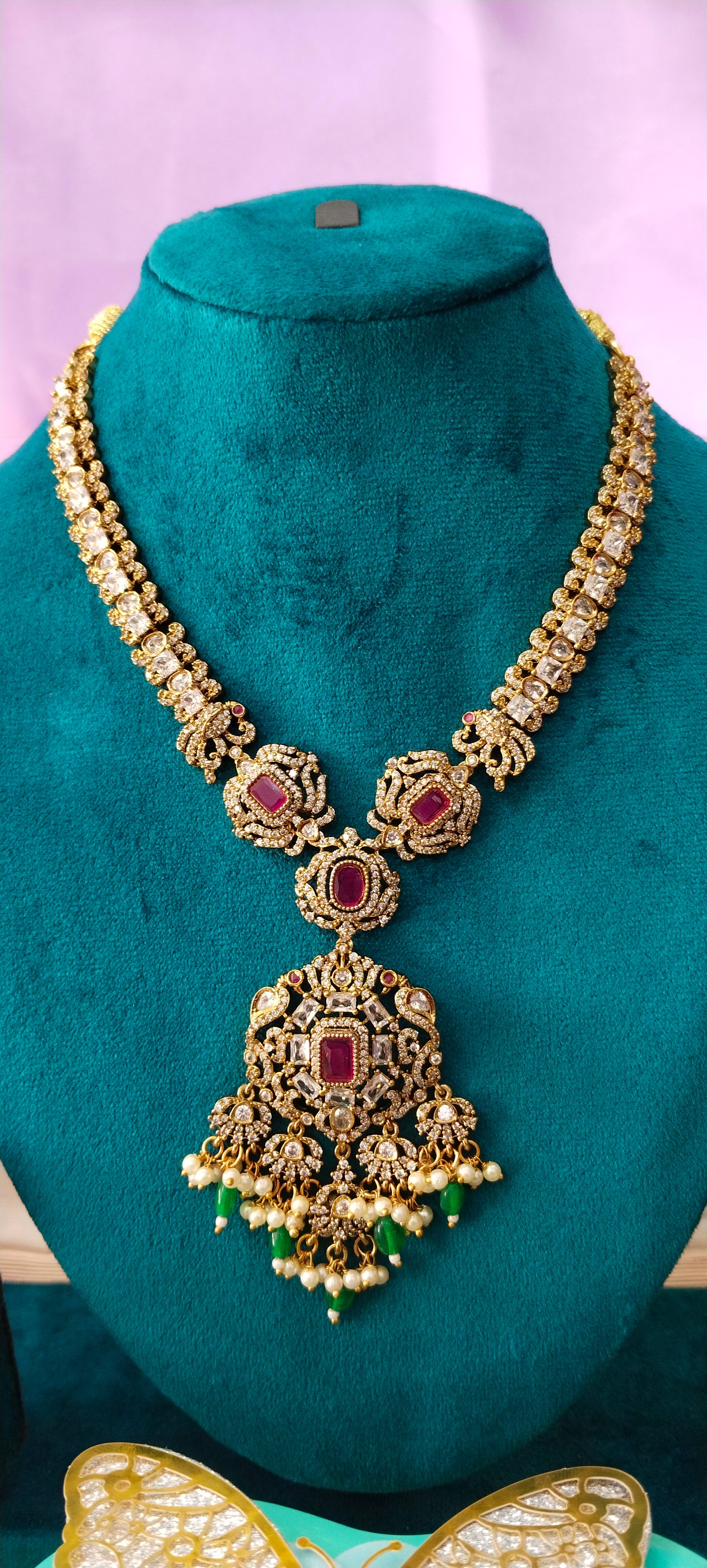This stunning CZ stone necklace features high-grade cubic zirconia crystals arranged in a sleek, contemporary pattern. Each stone is expertly cut to reflect maximum light, giving the piece a radiant, diamond-like sparkle. The smooth metal finish adds sophistication, making it ideal for both ethnic and western outfits. Lightweight, elegant, and crafted for everyday glamour or special occasions.