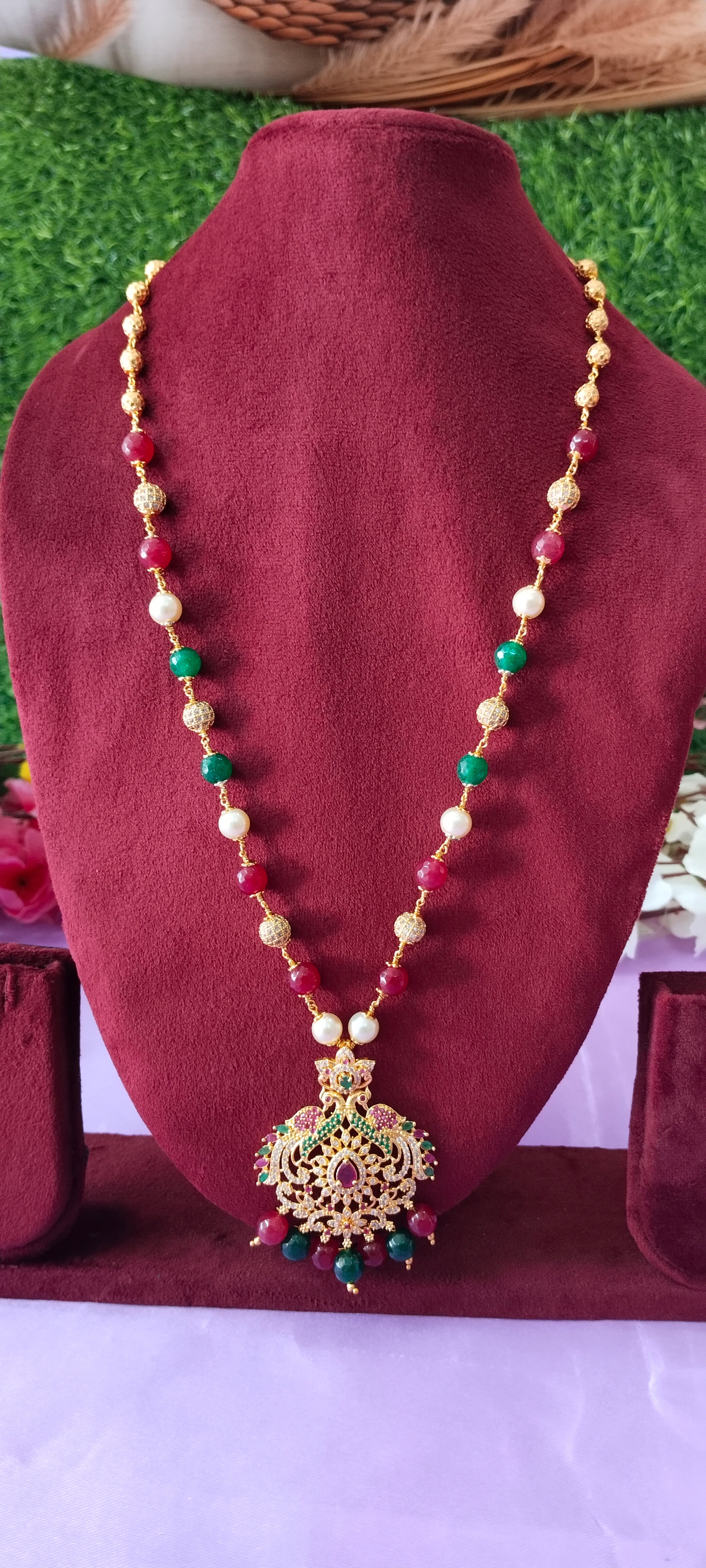 Long chain cz pendant with gold balls with no earrings