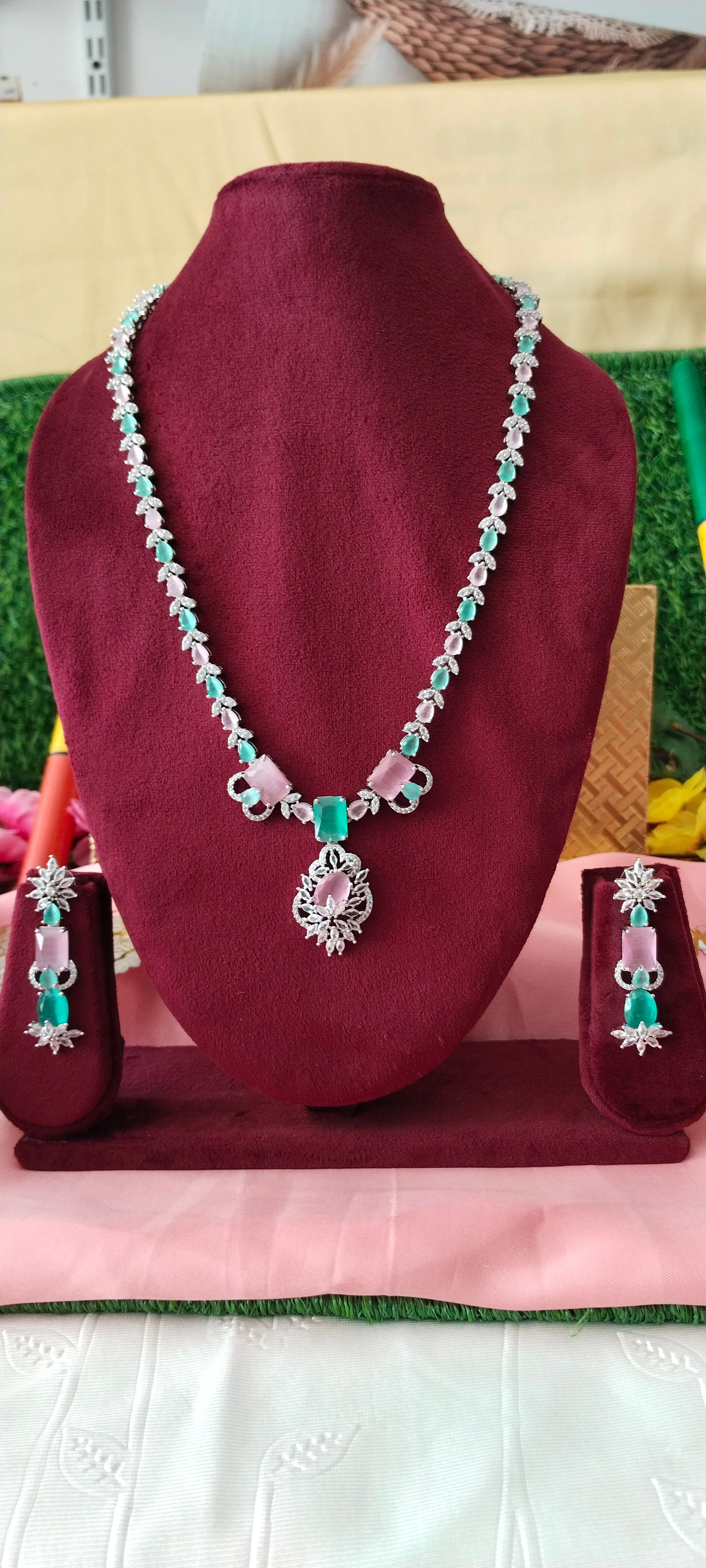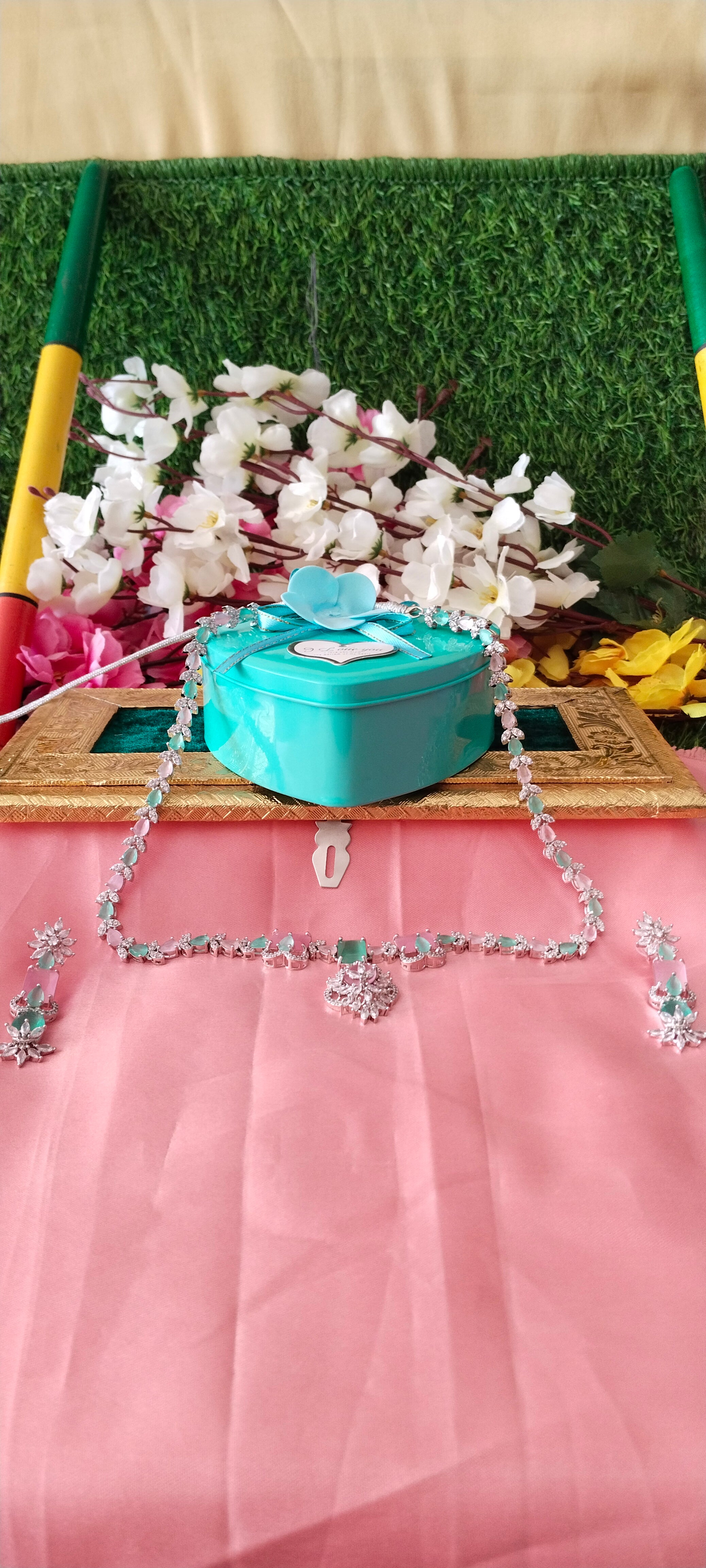 Make a grand style statement with this long, vibrant American Diamond multi-colour haram, crafted to bring brilliance and colour to any festive look. Designed with exquisite detailing, the haram features premium American Diamonds paired with a beautiful blend of multi-coloured stones, creating a radiant and eye-catching appeal. Its elongated, traditional silhouette adds a touch of regal charm, while the vibrant hues make it perfect for weddings, celebrations, and special occasions. Lightweight yet luxurious, this stunning piece drapes gracefully and enhances any ethnic ensemble with unmatched elegance.