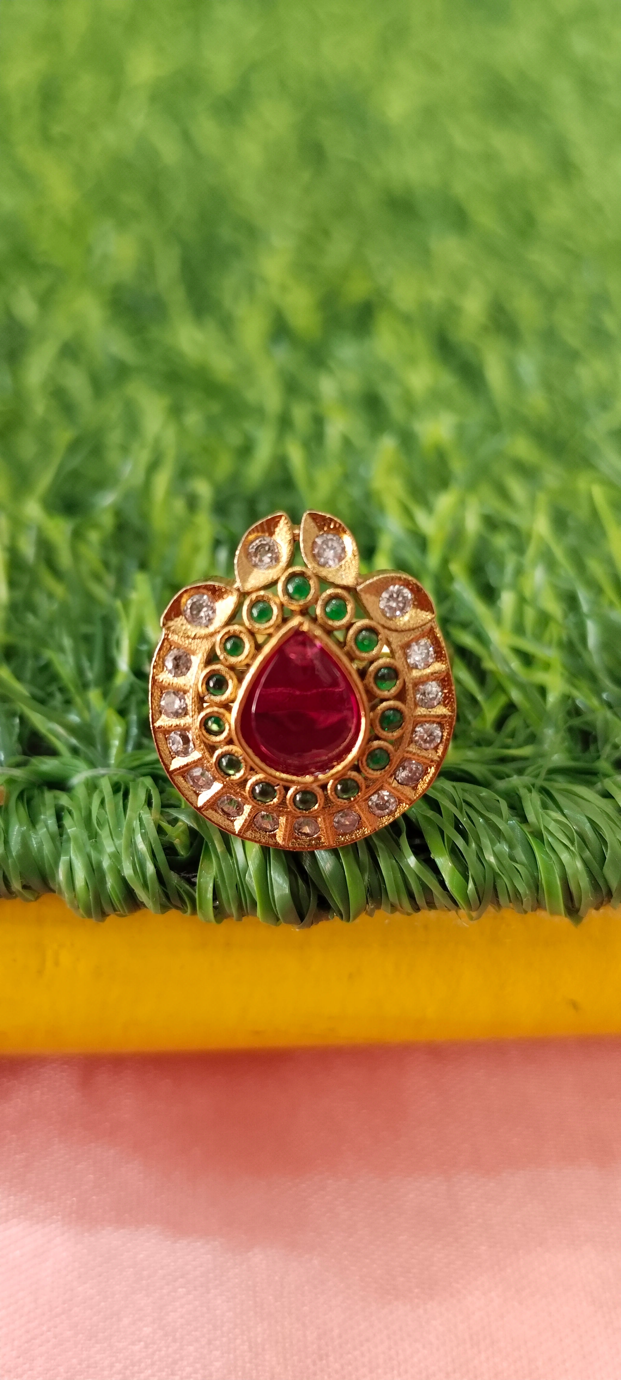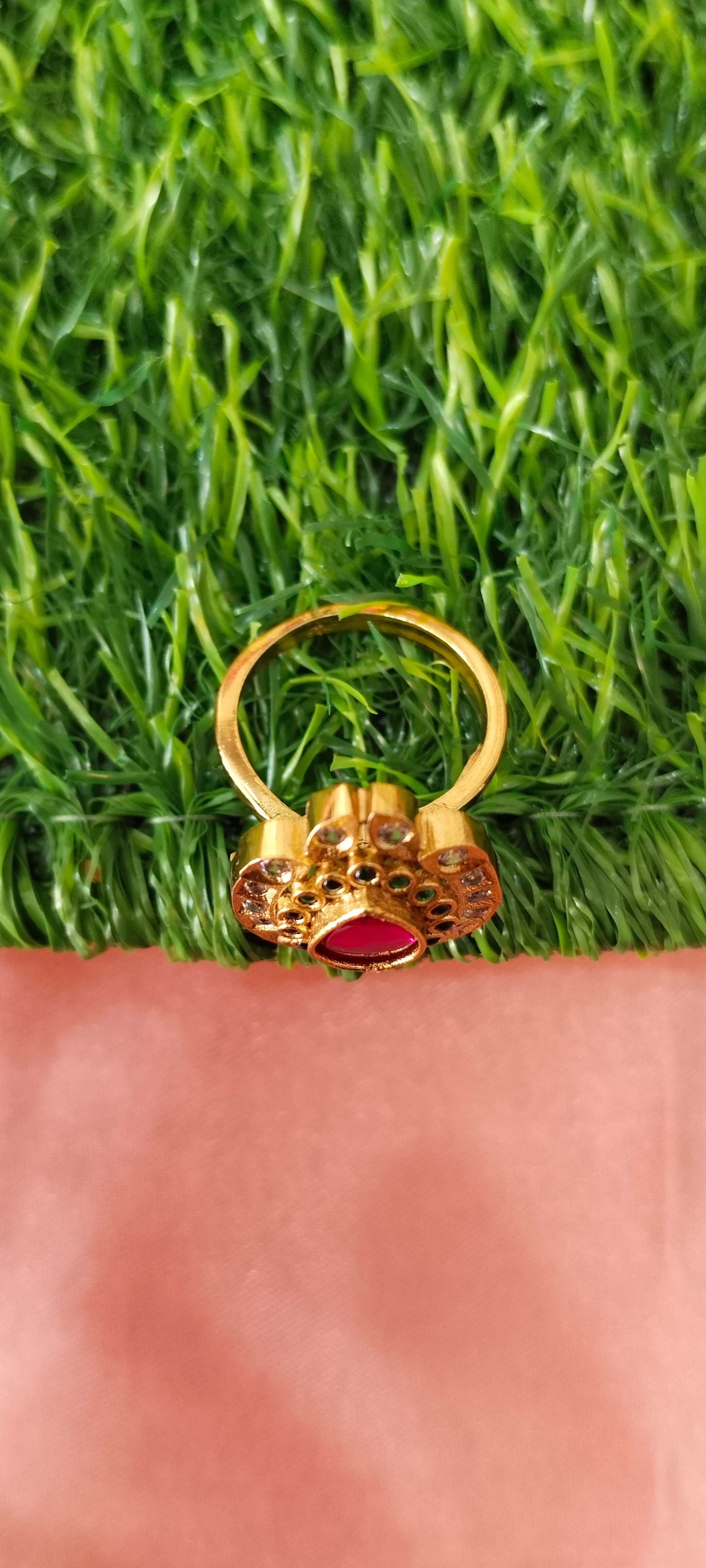 This stunning One Gram Gold Stone-Studded Finger Ring beautifully blends lightweight comfort with premium elegance. Crafted with high-quality one-gram gold plating, the ring features finely set sparkling stones that add a radiant touch to every movement. Its sleek finish and intricate detailing make it perfect for both daily wear and special occasions. Designed to complement traditional and modern outfits alike, this ring offers the rich look of gold while remaining affordable and durable. A charming accessory that enhances your style with subtle brilliance and timeless appeal.